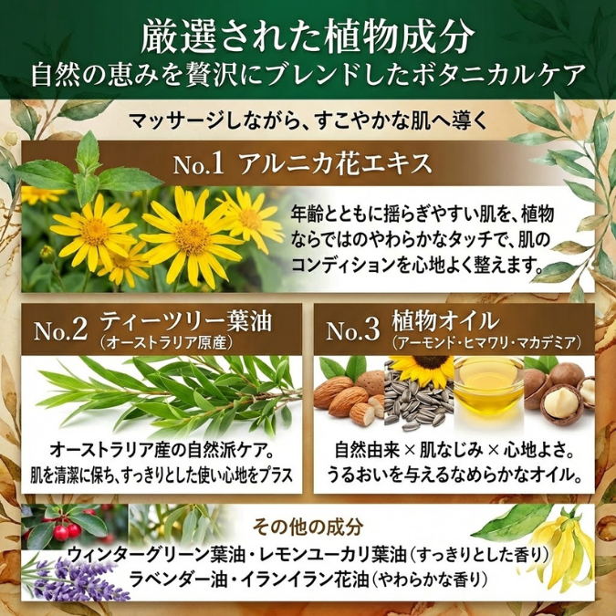 水、グリセリン、トリ(カプリル酸/カプリン酸)グリセリル、セテアリルアルコール、アーモンド油、ヒマワリ種子油、マカデミア種子油、フェノキシエタノール、トコフェロール、セテアレス-20、カプリリルグリコール、ステアリン酸、カルボマー、ダイズ油、ジメチコン、水酸化Na、ヒメコウジ葉油、セイヨウハッカ油、カンフル、アルニカ花エキス、アサ種子油、カプサイシン、ステアリン酸Mg、ユーカリシトリオドラ油、ティーツリー葉油、ユーカリ葉油、ラベンダー油、タラゴン油、イランイラン花油
